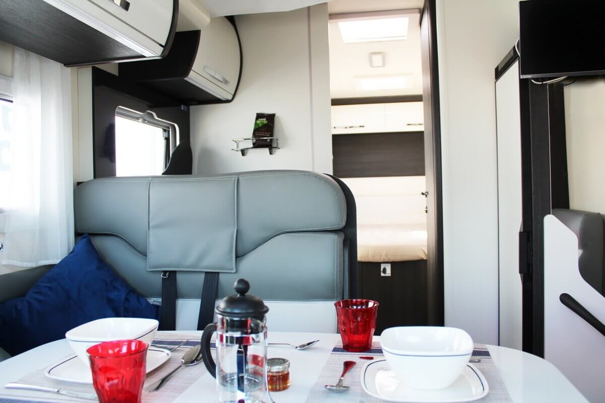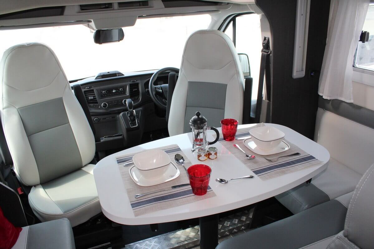 The camper has a refrigerator with freezer. There is a TV/DVD combination with satellite dish and a built-in Pioneer/radio/Apple play with DAB audio system. There is a hanging area for clothes and many cupboards and compartments. The front seats can be turned so that you can eat at the table. Under the table is an extendable leaf, creating more dining space.