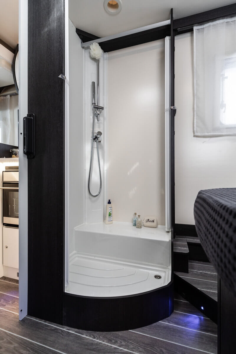 It is 160hp factory tuned and has a 6 speed gearbox. Furthermore, the camper has a built-in navigation system with reversing camera, airbags, cruise control, electrically operated windows, electrically operated mirrors, heated door mirrors, power steering and an electrically extendable step. The camper has a Truma heater with ring heating and a separate heater on electricity. There is a motor air conditioning system in the sitting cabin and a fixed air conditioning system above the sleeping area.