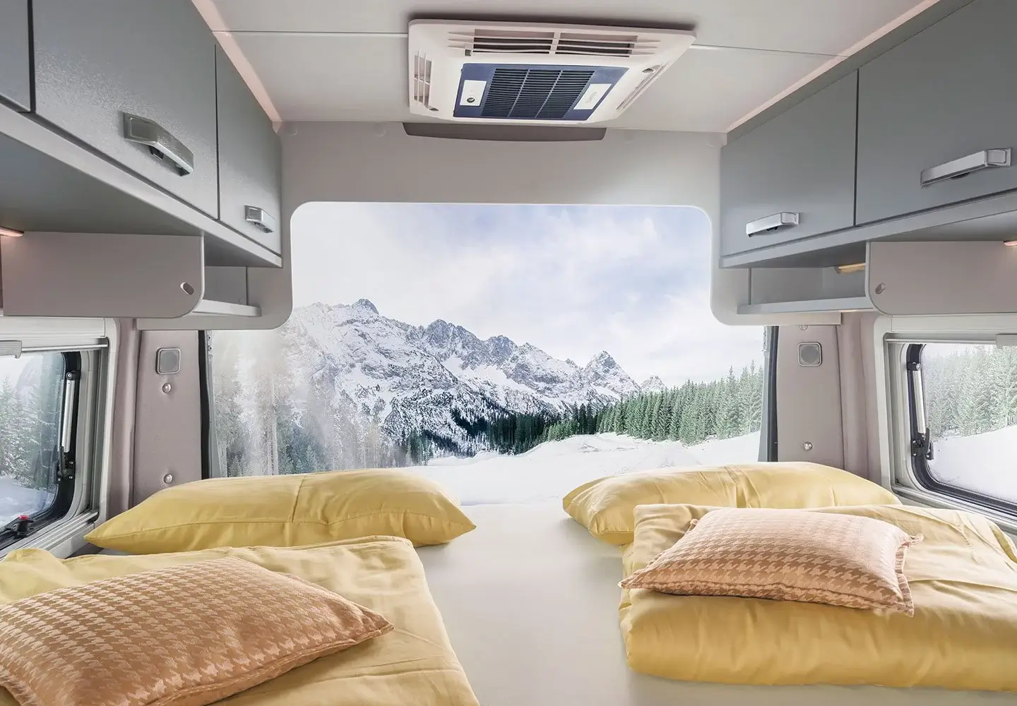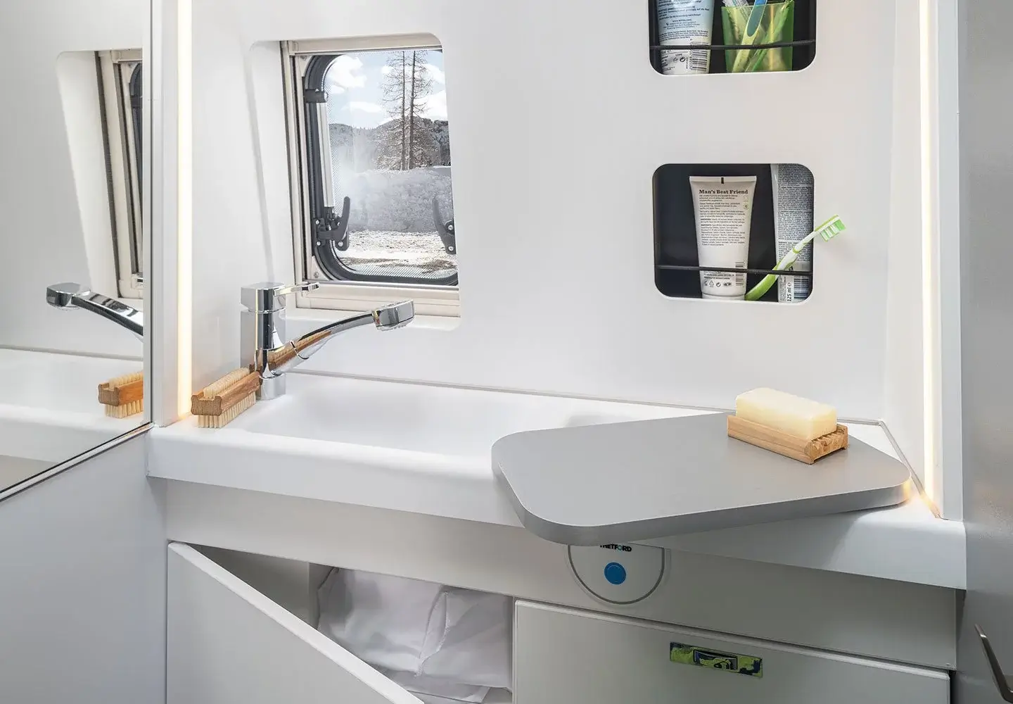 It is 160hp factory tuned and has a 6 speed gearbox. Furthermore, the camper has a built-in navigation system with reversing camera, airbags, cruise control, electrically operated windows, electrically operated mirrors, heated door mirrors, power steering and an electrically extendable step. The camper has a Truma heater with ring heating and a separate heater on electricity. There is a motor air conditioning system in the sitting cabin and a fixed air conditioning system above the sleeping area.