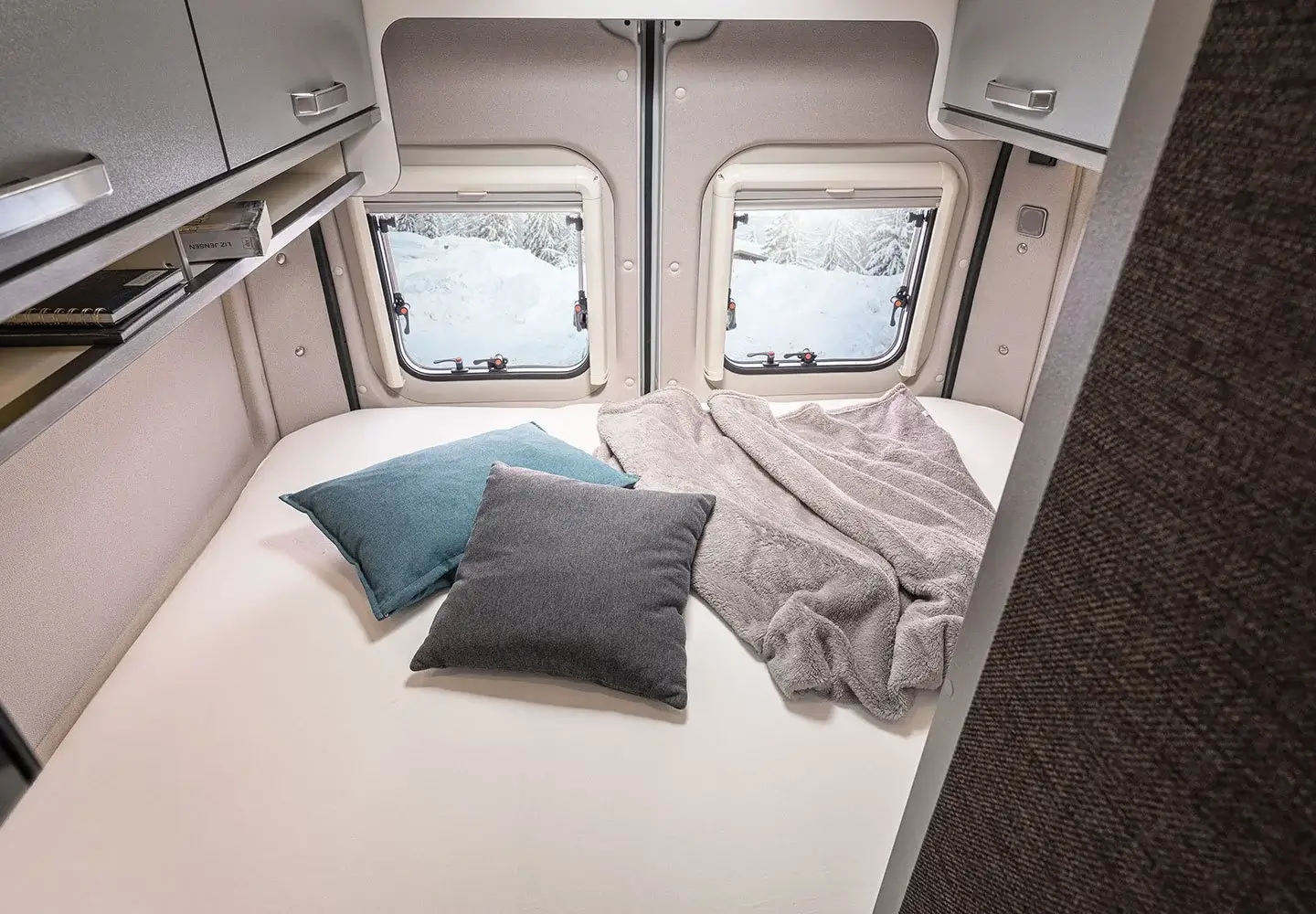 Our beautiful, complete Burstner ixeo 674 semi-integrated camper from 2010 is suitable for 4 people. This camper is 6.74 long and has 2 large width beds. A fixed bed in the back, accessible by 2 steps with lighting. Above the bed a shelf where you can put a glass and a socket to charge your mobile, this part can be shielded by a curtain. Above the seating area is a pull-down bed for 2 people.