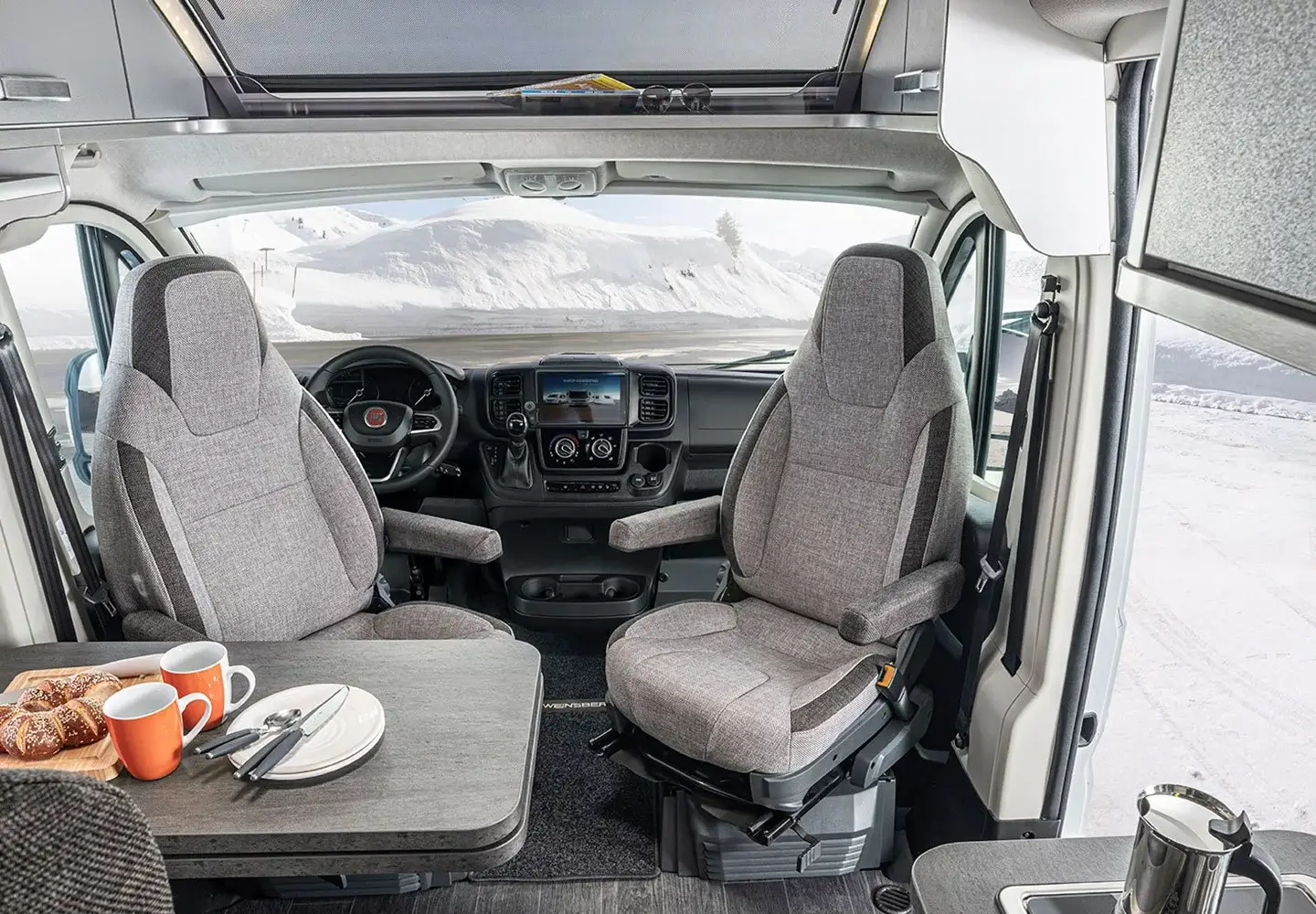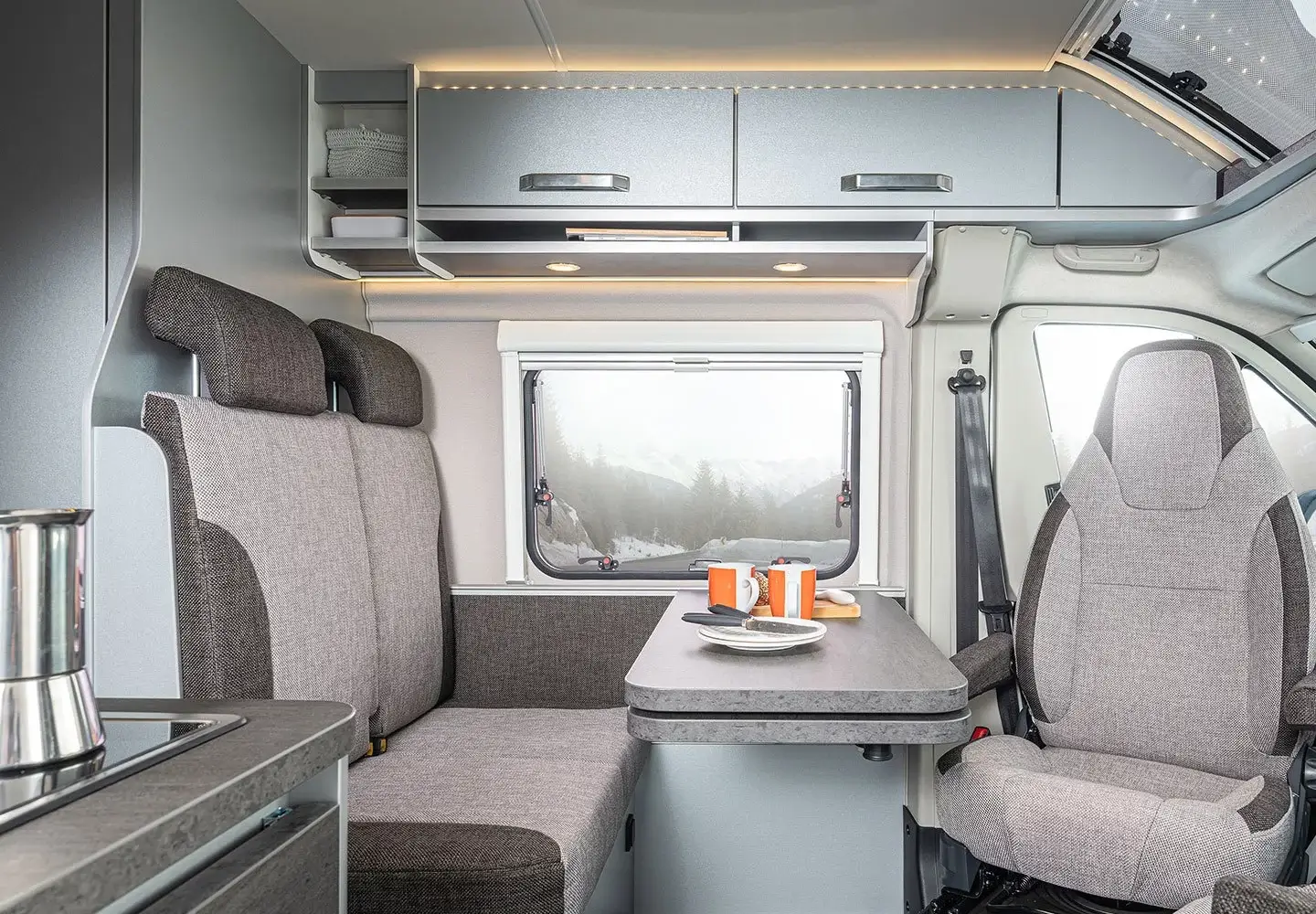 The camper has a refrigerator with freezer. There is a TV/DVD combination with satellite dish and a built-in Pioneer/radio/Apple play with DAB audio system. There is a hanging area for clothes and many cupboards and compartments. The front seats can be turned so that you can eat at the table. Under the table is an extendable leaf, creating more dining space.