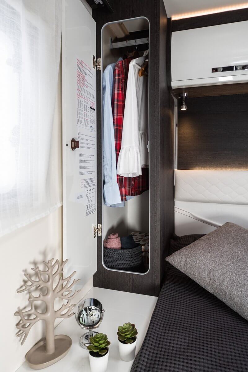 The camper has a refrigerator with freezer. There is a TV/DVD combination with satellite dish and a built-in Pioneer/radio/Apple play with DAB audio system. There is a hanging area for clothes and many cupboards and compartments. The front seats can be turned so that you can eat at the table. Under the table is an extendable leaf, creating more dining space.